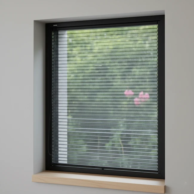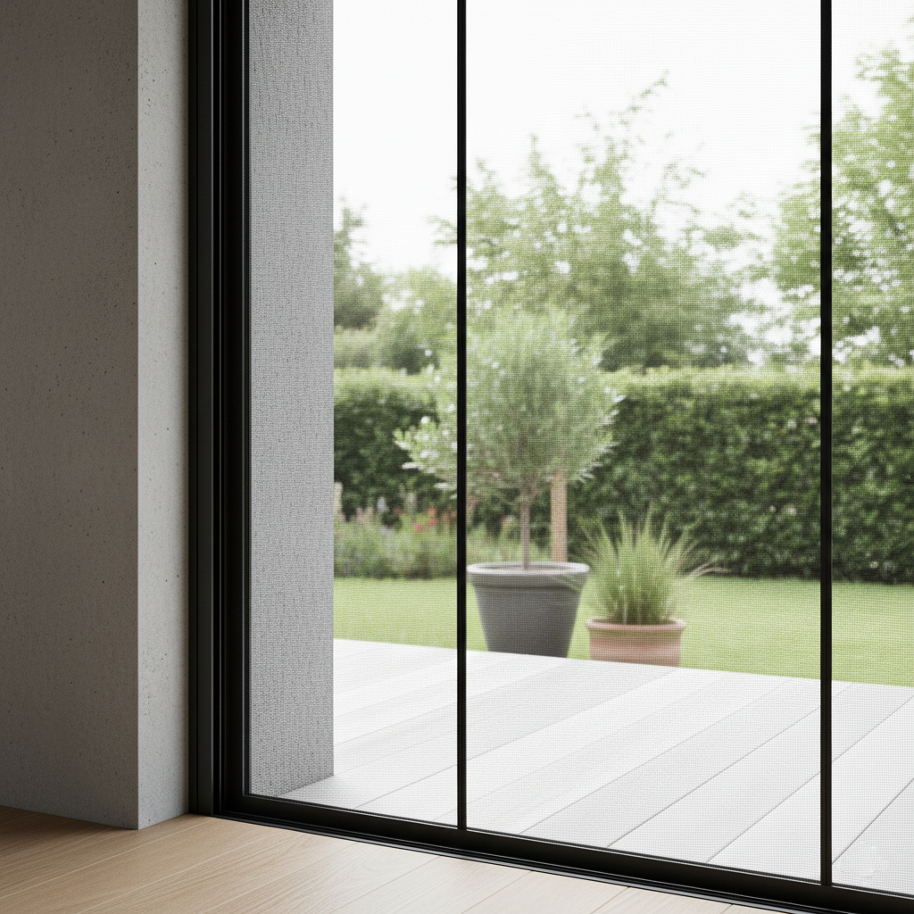 - Das Fliegengitternetz verläuft zwischen dem Sonnenschutz und dem Fenster – verhindert direkten äußeren Einfluss auf das Netz.