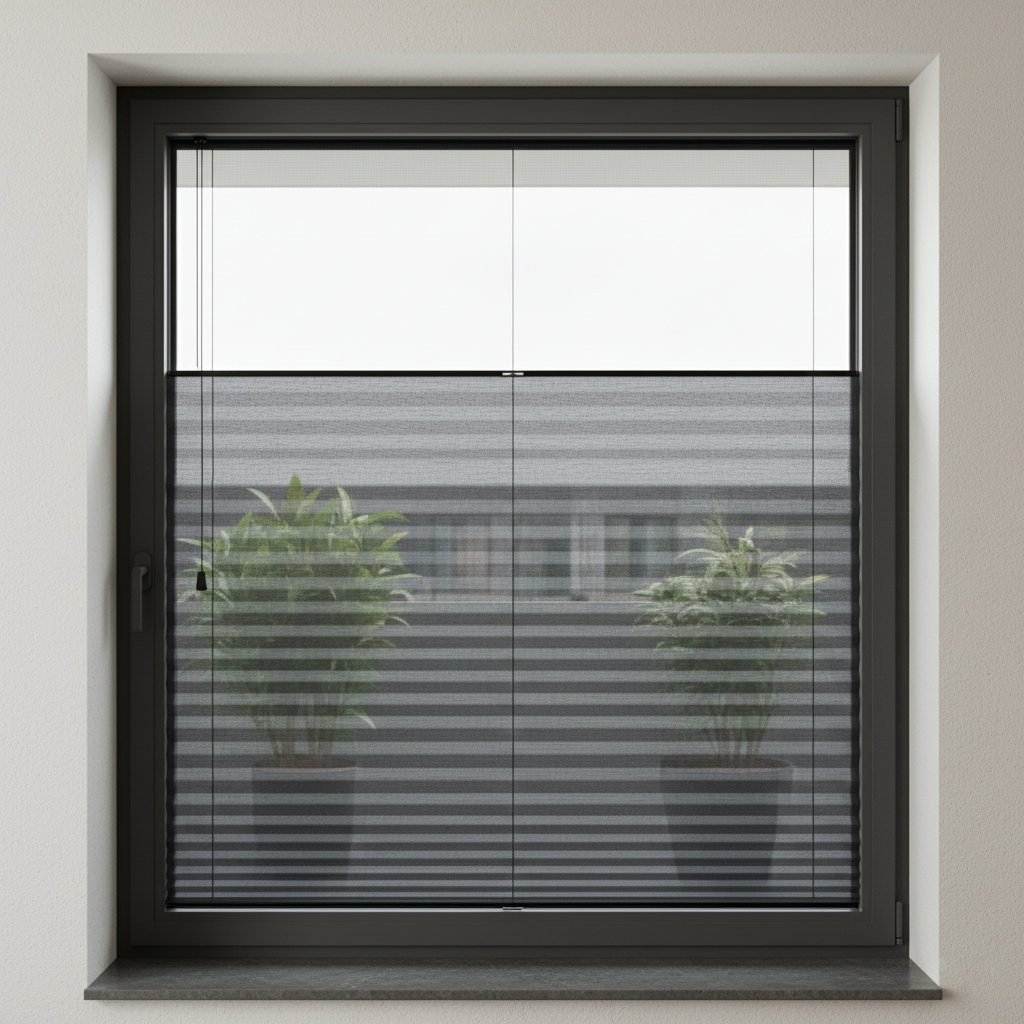 - Doppelter Plisseefliegengitter – maximale Breite 480 cm, Schließung zur Mitte hin