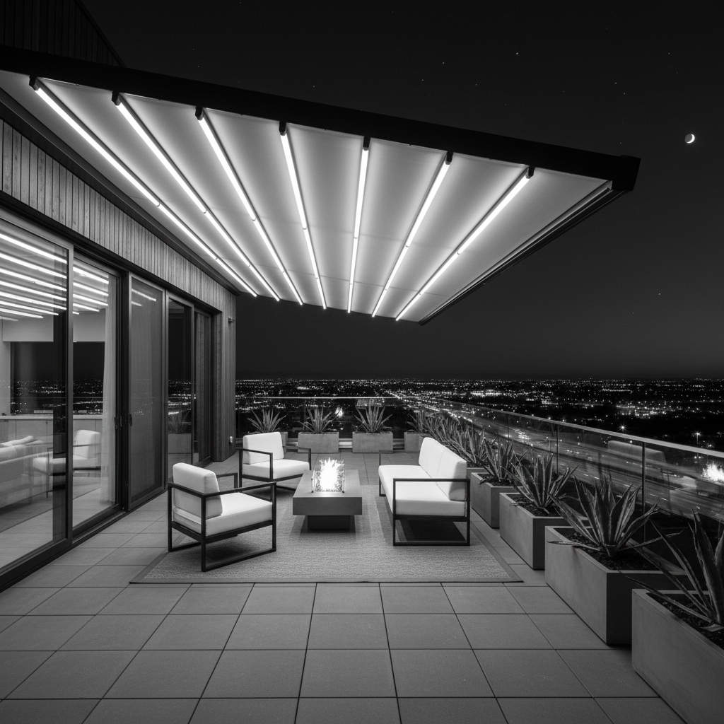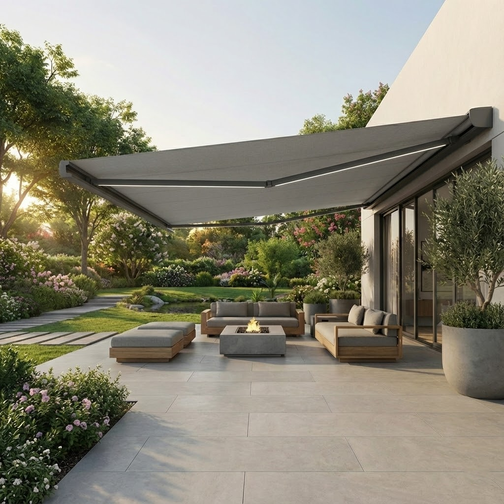 Die Markise R95 von Medle ist eine Premium-Kassettenmarkise mit vollständigem Schutz für Tuch und Arme. Integrierte LED-Beleuchtung und die Möglichkeit zur automatischen Steuerung bieten hohen Nutzungskomfort und Funktionalität – auch nach Einbruch der Dunkelheit.