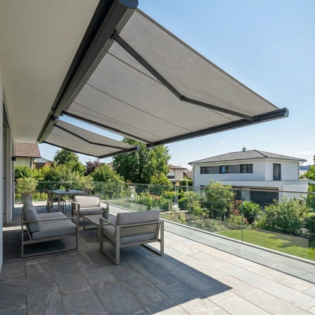 Kassettenmarkise mit vertikaler Ausrichtung und Federarmen, die sich bis zu 180° ausklappen lässt – ideal zur Lichtregulierung und effektiven Beschattung von Balkonen oder Fenstern.