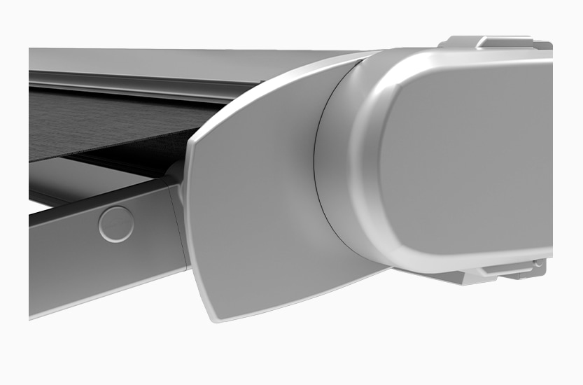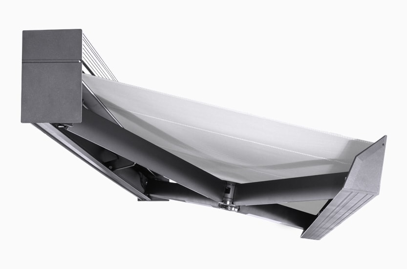 - Im eingefahrenen Zustand bildet die Markise einen einheitlichen, minimalistischen Korpus, der sich harmonisch in die Fassade einfügt.